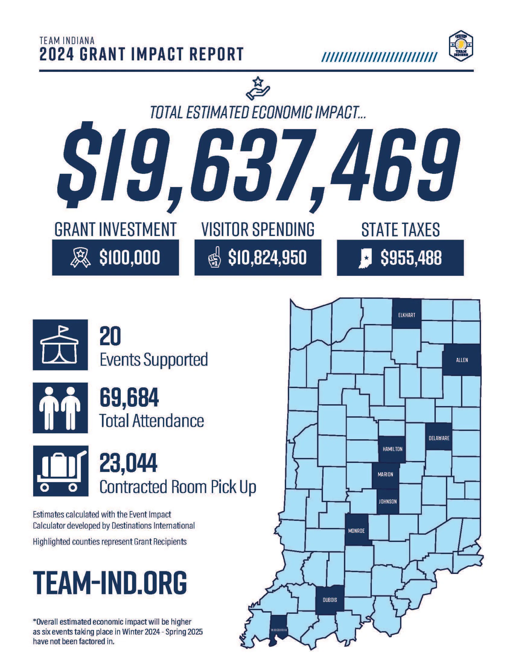 Team Indiana destinations utilize the Destinations International Event Impact Calculator. This tool calculates the economic impact that is generated through participant spending at sports events.